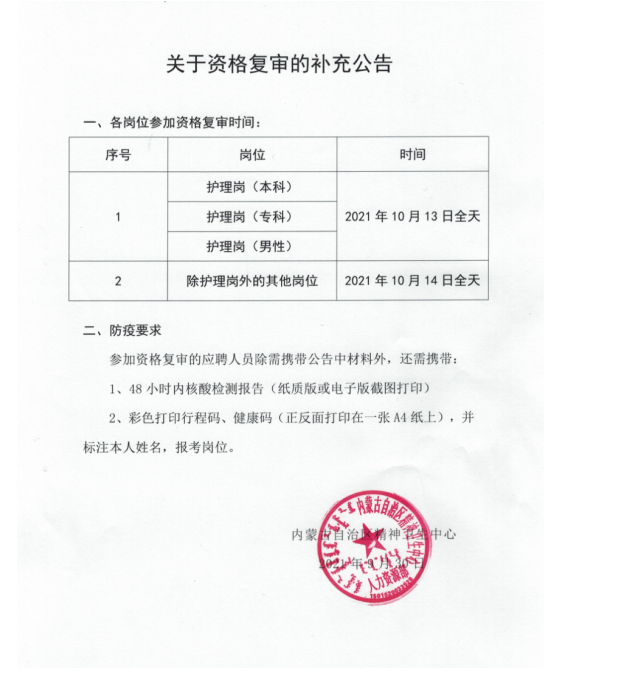 關(guān)于內(nèi)蒙古自治區(qū)第三醫(yī)院(精神衛(wèi)生中心)2021年度公開招聘資格復(fù)審的補(bǔ)充公告