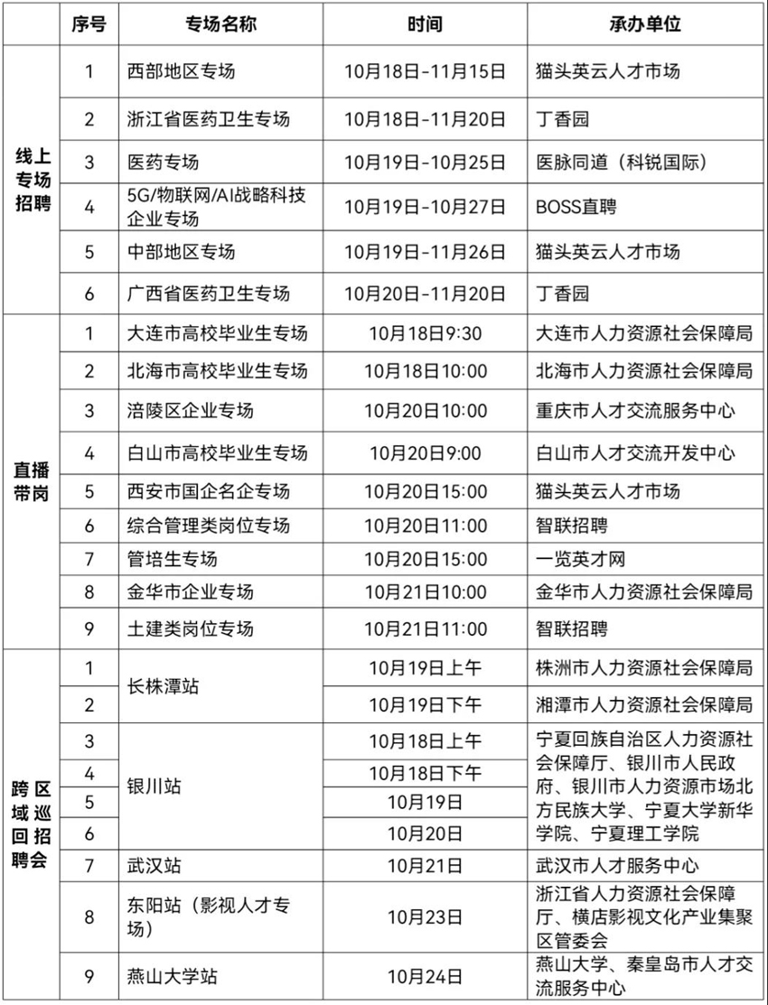 線上活動(dòng)15場(chǎng):包括醫(yī)藥、5G/物聯(lián)網(wǎng)/AI戰(zhàn)略科技企業(yè)、西部地區(qū)、浙江省醫(yī)藥、中部地區(qū)、廣東省醫(yī)藥等6場(chǎng)線上專(zhuān)場(chǎng)招聘會(huì)和9場(chǎng)直播帶崗。截至10月14日,已有2174家用人單位提供約4.7萬(wàn)個(gè)崗位,后期將有更多用人單位陸續(xù)加入。